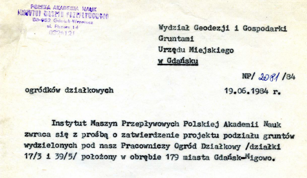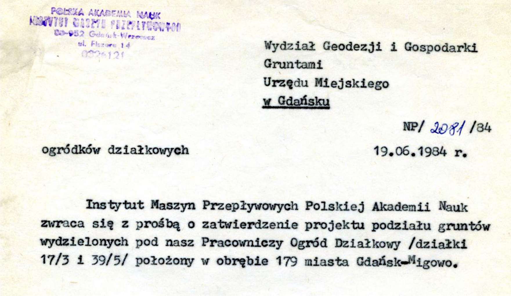 Pismem z 19 czerwca 1984 r. Instytut Maszyn Przepływowych zwrócił się do Urzędu Miejskiego w Gdańsku z prośbą o zatwierdzenie projektu podziału gruntów, przesyłając również mapę geodezyjną przedstawiającą zarys przyszłego ogrodu działkowego, który przetrwał do dziś w zbliżonych granicach.