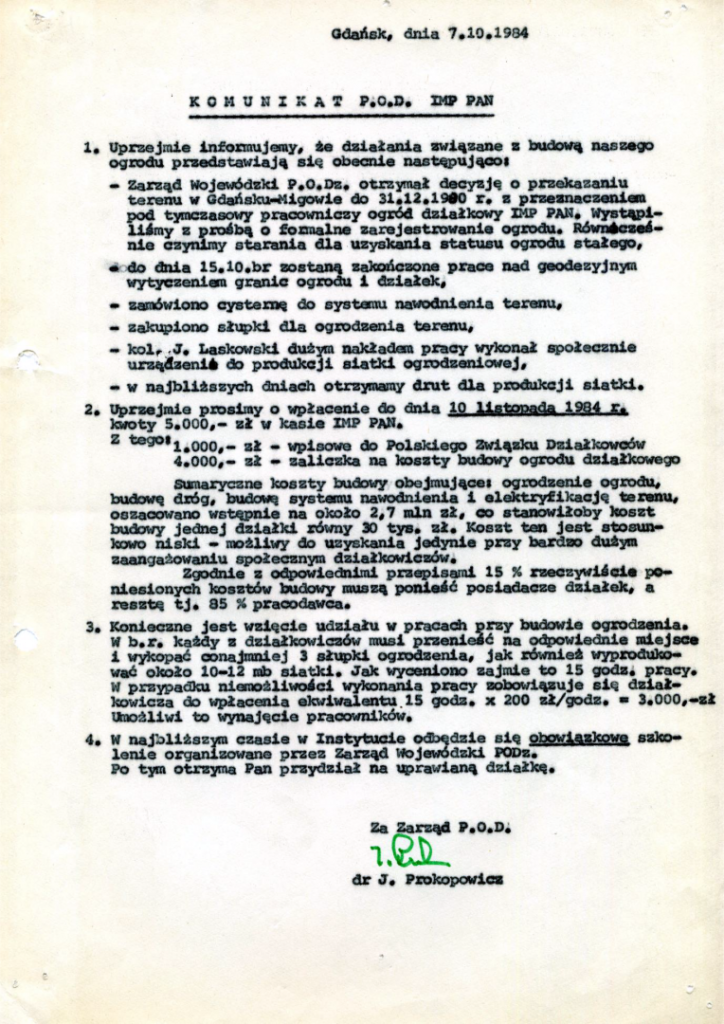 Zachował się też dokument z 7 października 1984 r. pod nazwą „Komunikat P.O.D. IMP PAN, w którym szczegółowo opisane są prace związane z budową ogrodu. Bardzo duży udział mieli pierwsi działkowcy, którzy zostali zobowiązani do wyprodukowania własnoręcznie 10 – 12 metrów bieżących siatki metalowej o wysokości 1,8 m, przeniesienia na odpowiednie miejsce i wkopania co najmniej 3 słupków betonowych, co przedstawia poniższy komunikat. Aby przekonać się, jak ciężka to była praca wystarczy przejść się wzdłuż ogrodzenia i zobaczyć w jak trudnym terenie zostały transportowane ciężkie słupki betonowe, które następnie wkopywano, zalano betonem, po czym założono wysoką siatkę metalową.