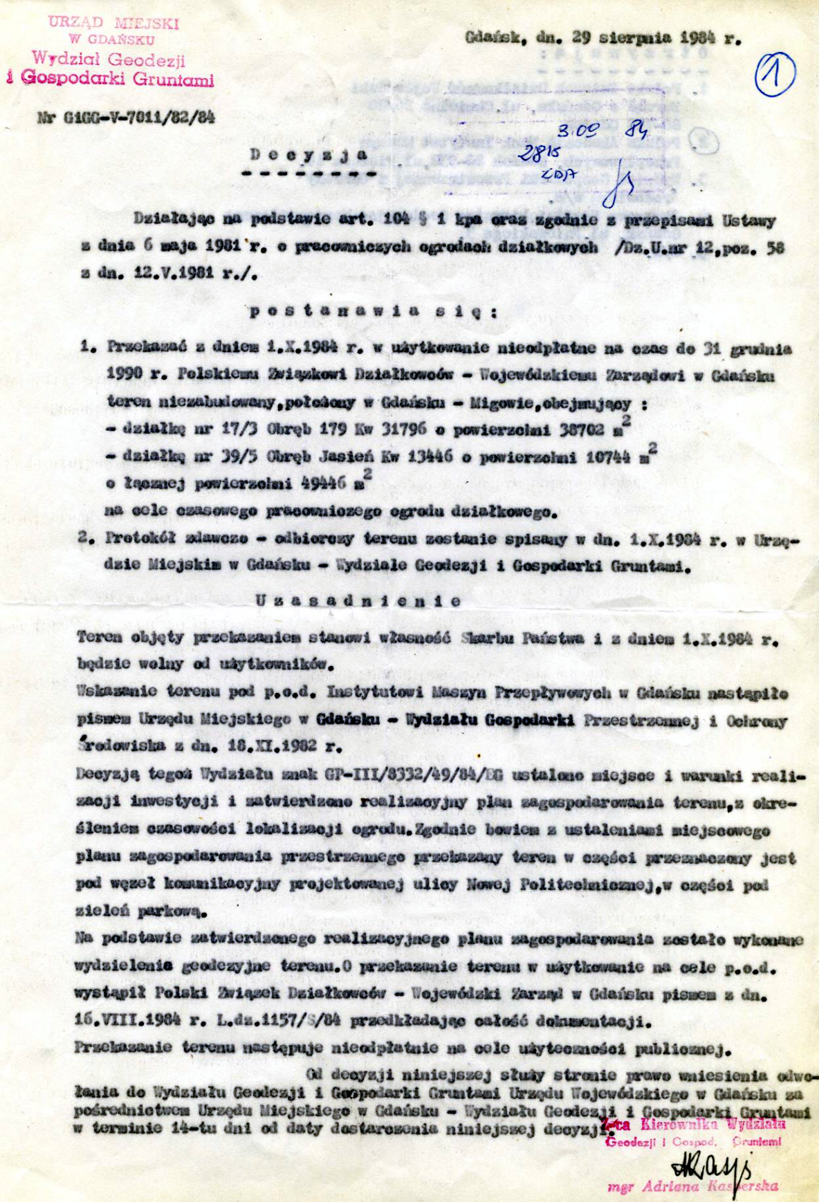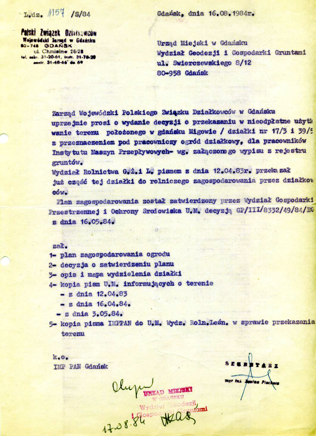 Następnie Polski Związek Działkowców zwraca się pismem z 16 sierpnia 1984 r. do Urzędu Miejskiego w Gdańsku o wydanie decyzji o nieodpłatne przekazanie terenu pod utworzenie pracowniczego ogrodu działkowego.