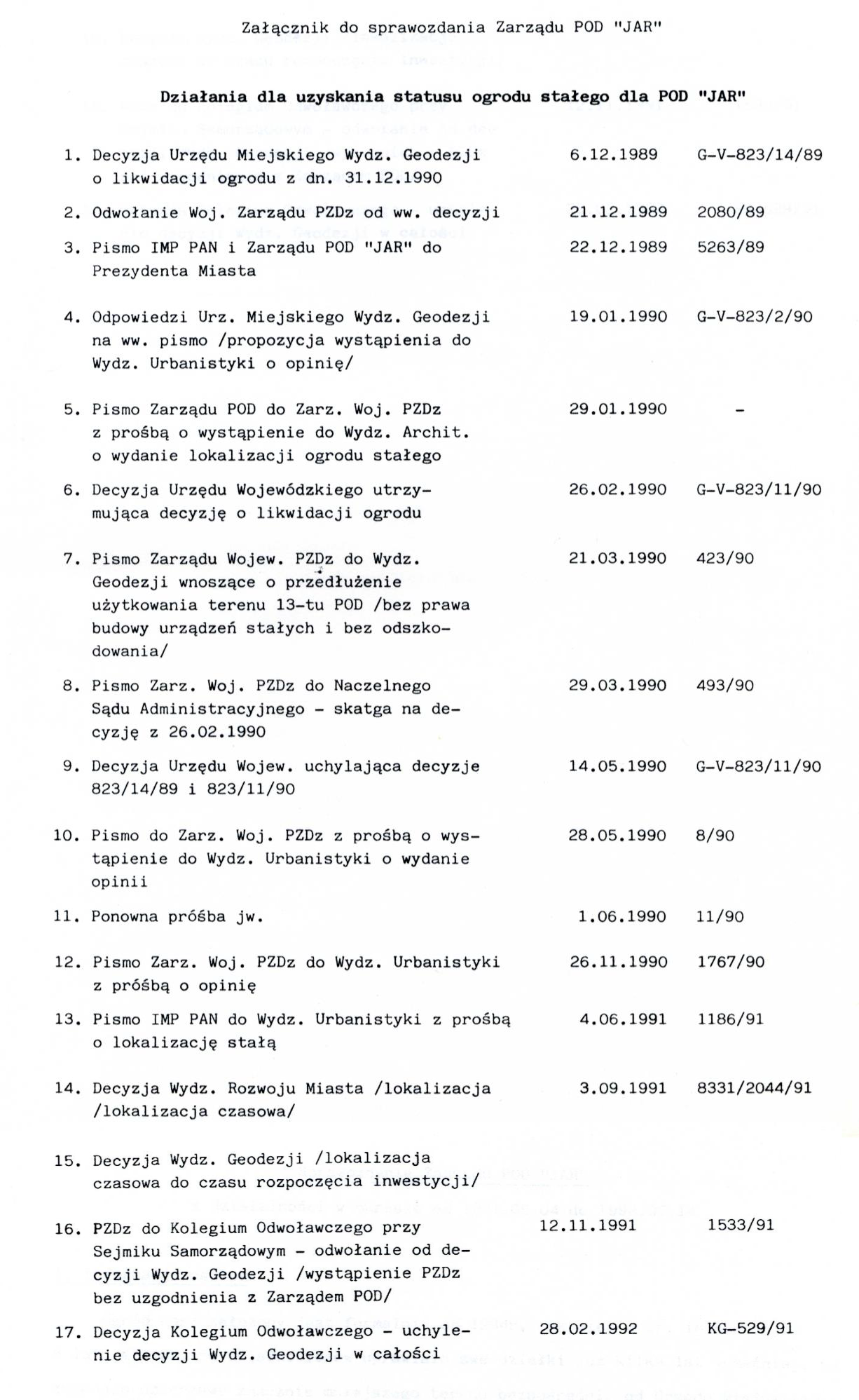 Wojewódzki Zarząd PZD zaskarżył powyższą decyzję i 14 maja 1990 r. Sąd Administracyjny uchylił decyzję o likwidacji ogrodu przekazując sprawę do ponownego rozpatrzenia. W uzasadnieniu decyzji Sąd Administracyjny powołał się na argumenty WZ PZD, który wnosił o przedłużenie użytkowania terenu na dotychczasowych warunkach tj. bez prawa do budowy urządzeń stałych (np. wodociągu, domu działkowca) i bez prawa do odszkodowań za nasadzenia i naniesienia w razie likwidacji ogrodu, wnosząc o utrzymanie statusu ogrodu czasowego do czasu realizacji zadań inwestycyjnych określonych w planie przestrzennego zagospodarowania tego terenu. W dalszym ciągu POD „JAR” starał się o uzyskanie statusu ogrodu stałego, a starania te obrazuje załącznik do sprawozdania Zarządu na zebranie sprawozdawcze w dniu14 lipca 1992 r.