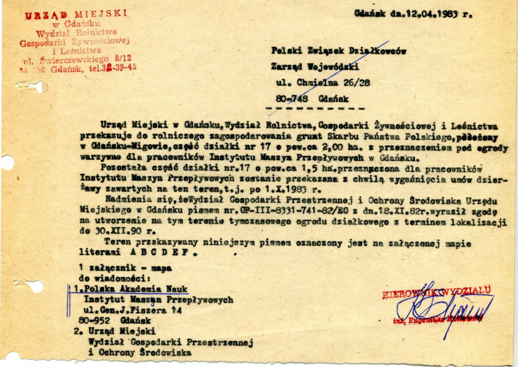 Odpowiadając na to pismo, Wydział Rolnictwa Gospodarki Żywnościowej i Leśnictwa Urzędu Miejskiego w Gdańsku pismem z 12 kwietnia 1983 r., poinformował Polski Związek Działkowców, Zarząd Wojewódzki w Gdańsku (który w owym czasie miał swoją siedzibę przy ul. Chmielnej 26/28), o przekazaniu do rolniczego zagospodarowania grunt Skarbu Państwa z przeznaczeniem pod ogrody warzywne dla pracowników Instytutu Maszyn Przepływowych w Gdańsku. Z pisma możemy dowiedzieć się również, iż teren ten był przekazany na tymczasowy ogród działkowy do 30 grudnia 1990 r. Będzie to ważna data w historii Ogrodu, ponieważ rozpocznie się wówczas batalia o przekształcenie ogrodu tymczasowego na ogród stały, ale o tym będzie w dalszej części naszej historii.